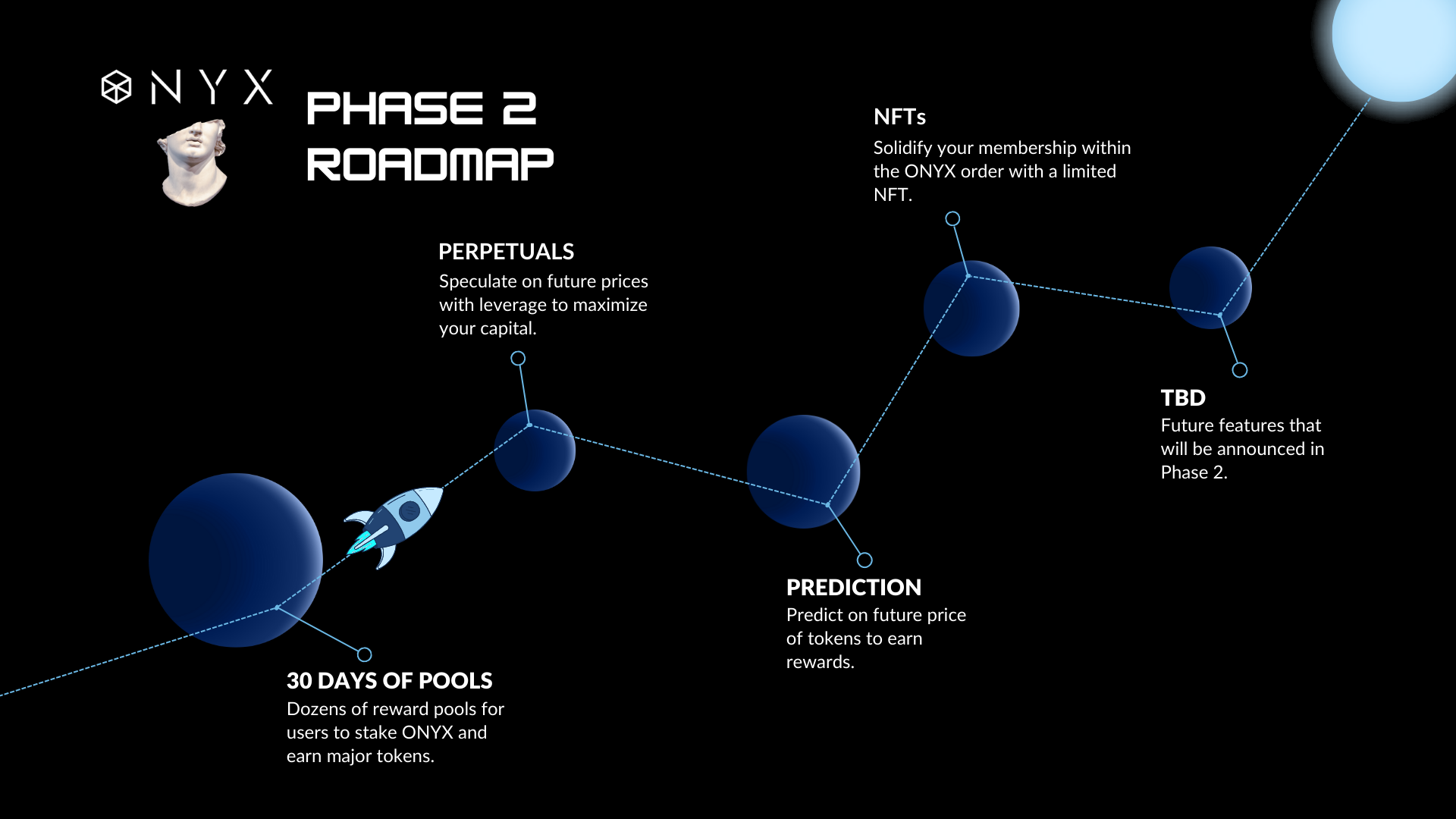 The next phase of Onyx DAO will be centered around 4 major features: 30 Days of Pools, Perpetuals, Predictions, and NFTs.